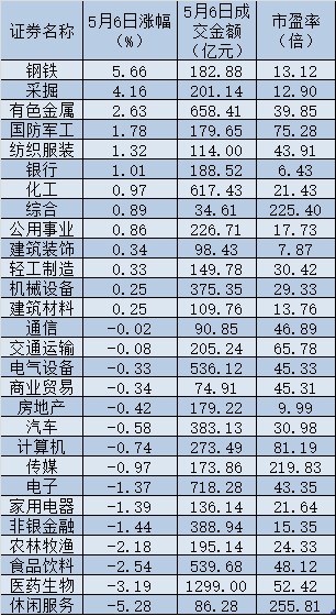 表:5月6日申萬一級行業(yè)市場表現(xiàn)一覽