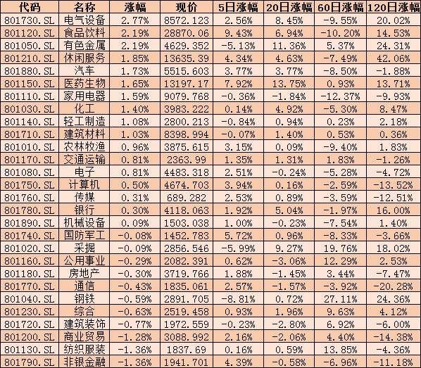 從申萬(wàn)一級(jí)28個(gè)行業(yè)來(lái)看,周一,電氣設(shè)備、有色金屬和食品飲料等三行業(yè)漲幅居前均超2%,分別為2.77%、2.19%和2.19%。而紡織服裝、非銀金融和商業(yè)貿(mào)易跌幅均超1%。
