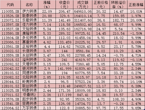 《證券日報》記者對同花順數(shù)據(jù)統(tǒng)計后發(fā)現(xiàn),在362只可轉(zhuǎn)債中,251只可轉(zhuǎn)債實現(xiàn)上漲,占比近七成。其中,23只可轉(zhuǎn)債漲幅超2%,伊力轉(zhuǎn)債、聯(lián)泰轉(zhuǎn)債、樂歌轉(zhuǎn)債等3只可轉(zhuǎn)債漲幅均在10%以上,分別為22.09%、20.88%、11.39%,佳力轉(zhuǎn)債、文燦轉(zhuǎn)債、康隆轉(zhuǎn)債、多倫轉(zhuǎn)債等4只可轉(zhuǎn)債漲幅也位居前列,均超5%。