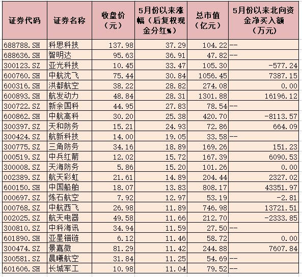 表:5月份以來漲幅超11%國防軍工股一覽