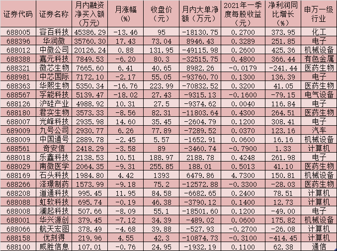 表:6月份以來實(shí)現(xiàn)融資凈買入的科創(chuàng)50指數(shù)成份股