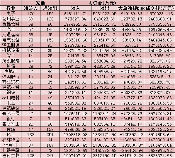 從資金層面看,周四,A股大單資金整體凈流出58.25億元,其中,有1473只個(gè)股呈現(xiàn)資金凈流入,有2751只個(gè)股呈現(xiàn)資金凈流出。從申萬一級(jí)的28個(gè)行業(yè)來看,有7個(gè)行業(yè)呈現(xiàn)資金凈流入態(tài)勢(shì),其中,電子行業(yè)資金凈流入居首,達(dá)94.92億元,緊隨其后的是公用事業(yè)、食品飲料等2個(gè)行業(yè)資金凈流入分別為12.57億元和6.29億元。另外,21個(gè)行業(yè)均呈現(xiàn)資金凈流出態(tài)勢(shì),其中,醫(yī)藥生物、非銀金融等行業(yè),資金凈流出均超20億元。