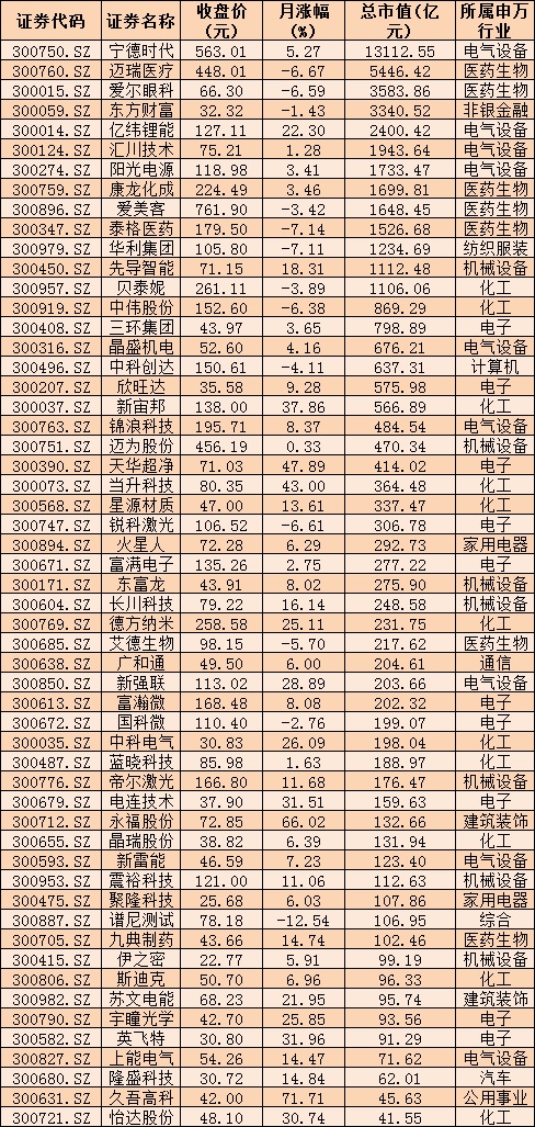 記者統(tǒng)計(jì)發(fā)現(xiàn),7月份以來(lái)截至周二收盤,有55家創(chuàng)業(yè)板上市公司的股價(jià),創(chuàng)出了歷史新高。其中,寧德時(shí)代、邁瑞醫(yī)療、愛(ài)爾眼科、東方財(cái)富、億緯鋰能、匯川技術(shù)、陽(yáng)光電源、康龍化成、愛(ài)美客、泰格醫(yī)藥、華利集團(tuán)、先導(dǎo)智能、貝泰妮等13只創(chuàng)業(yè)板公司的總市值均在千億元以上。