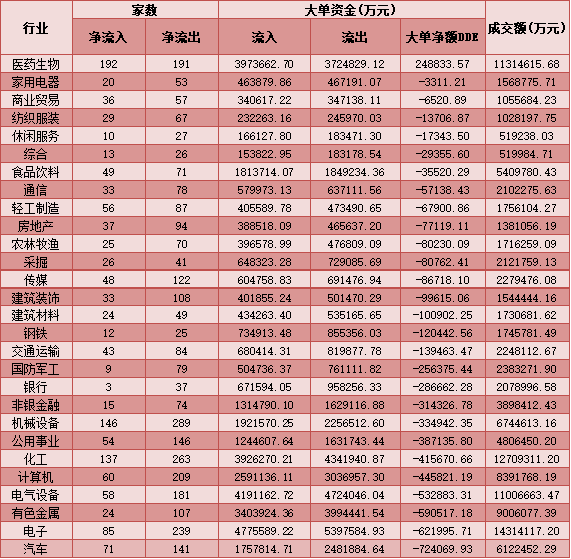 二、周三(7月14日)申萬一級行業(yè)大單資金流向