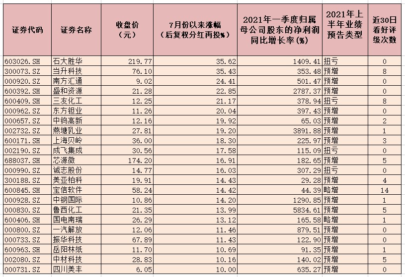 7月份以來(lái),上述業(yè)績(jī)預(yù)喜的公司也呈現(xiàn)了不錯(cuò)的市場(chǎng)表現(xiàn),有73只個(gè)股期間跑贏上證指數(shù)(期間累計(jì)下跌1.75%),占比超七成,其中,石大勝華、當(dāng)升科技、南方匯通、盛和資源、三友化工、東方鉭業(yè)等6只個(gè)股期間累計(jì)漲幅均超20%,盡顯強(qiáng)勢(shì)。