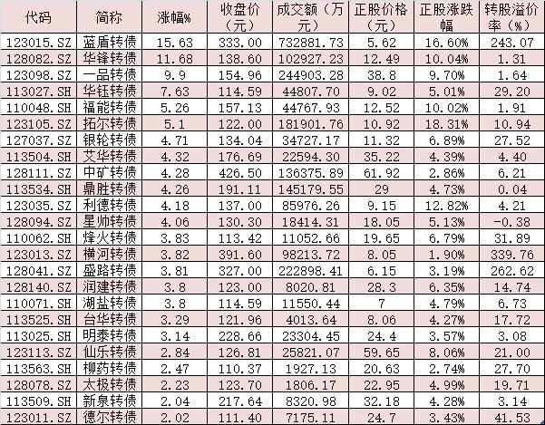 具體到個券方面,在368只可轉(zhuǎn)債中,有24只可轉(zhuǎn)債漲幅超2%,藍(lán)盾轉(zhuǎn)債、華鋒轉(zhuǎn)債漲幅均超10%,分別達(dá)到15.63%、11.68%,一品轉(zhuǎn)債(9.9%)、華鈺轉(zhuǎn)債(7.63%)、福能轉(zhuǎn)債(5.26%)和拓爾轉(zhuǎn)債(5.1%)等4只可轉(zhuǎn)債漲幅也均在5%以上,表現(xiàn)搶眼。