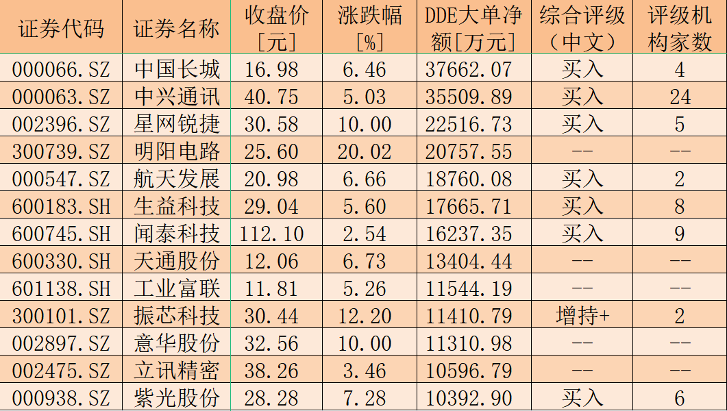當(dāng)然,5G板塊的行情也與資金面因素相關(guān)。今日,5G板塊大單資金凈買入額為6.98億元,共有120只個(gè)股呈現(xiàn)大單資金凈買入狀態(tài),合計(jì)凈買入金額達(dá)到42.87億元。具體來看,中國(guó)長(zhǎng)城(37662.07萬元)、中興通訊(35509.89萬元)、星網(wǎng)銳捷(22516.73萬元)、明陽電路(20757.55萬元)、航天發(fā)展(18760.08萬元)等13只個(gè)股獲大單資金凈買入額均超1億元;數(shù)碼視訊(9936.32萬元)、滬電股份(9222.81萬元)、東方通(8246.01萬元)、北斗星通(6719.04萬元)、華工科技(6675.64萬元)等51只個(gè)股獲大單資金凈買入額超1000萬元。