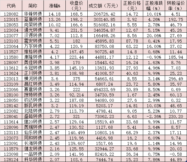 具體到個券方面,8月3日,在370只可轉(zhuǎn)債中,有28只可轉(zhuǎn)債漲幅超2%,華鋒轉(zhuǎn)債、藍盾轉(zhuǎn)債、尚榮轉(zhuǎn)債等3只可轉(zhuǎn)債漲幅均超10%,分別達到14.18%、13.26%、10.02%,通光轉(zhuǎn)債(9.41%)、漢得轉(zhuǎn)債(7.02%)、震安轉(zhuǎn)債(5.51%)、萬孚轉(zhuǎn)債(4.22%)、維格轉(zhuǎn)債(4.2%)和康隆轉(zhuǎn)債(4.17%)等6只可轉(zhuǎn)債漲幅也均在4%以上。