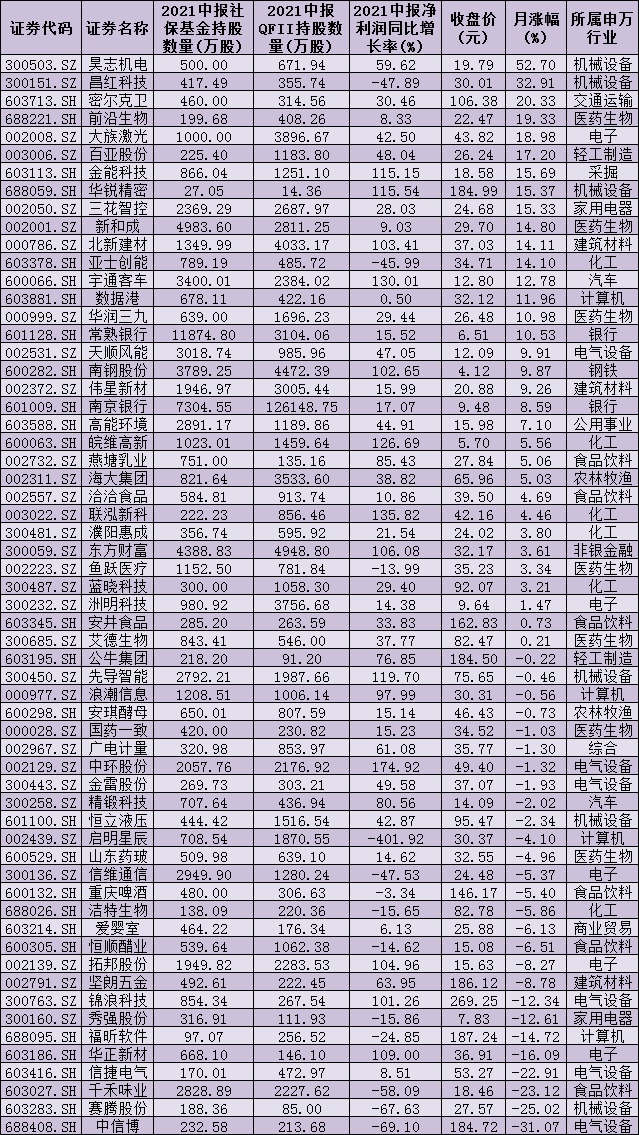 表:60只被社?;鸷蚎FII同時(shí)持有的個(gè)股情況: