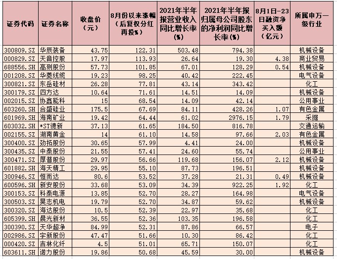 表:8月份以來漲幅超50%的上半年營收和凈利雙增長股一覽