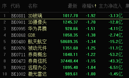 此外,3D玻璃、3D攝像頭頭和華為昇騰等10類板塊跌幅均超1%。