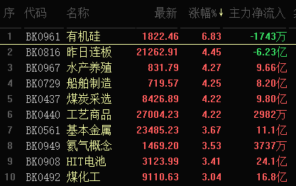 從盤面來看,有機(jī)硅板塊指數(shù)飆升6.83%,排名第一,板塊大單資金凈流出達(dá)1743萬元,有恒星科技等7只個(gè)股漲停。