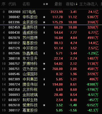 HIT電池(又被稱為HJT)保持強(qiáng)勢(shì),板塊上漲3.41%,大單資金凈流入達(dá)24.1億元,概念板塊近3日漲幅達(dá)11.48%,金辰股份和晶澳科技今日漲停。