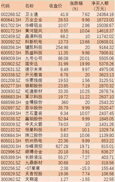 有31只個(gè)股受到前十大營(yíng)業(yè)部搶籌,其中,衛(wèi)士通(24364.16萬元)、萬業(yè)企業(yè)(16723.00萬元)、華峰鋁業(yè)(15038.67萬元)、黃河旋風(fēng)(14618.37萬元)、晶澳科技(11742.02萬元)、科新機(jī)電(10608.01萬元)等6只個(gè)股凈買入額過億元。