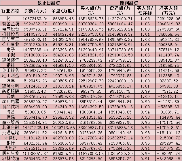從行業(yè)分布來看,下半年以來,在28個申萬一級行業(yè)中,14個行業(yè)期間獲融資凈買入。其中,化工、有色金屬、電氣設備等三行業(yè)最受融資客青睞,融資凈買入額均超100億元,分別為229.12億元、204.83億元和170.4億元,合計達604.35億元;緊隨其后的是機械設備、國防軍工、公用事業(yè)、電子等行業(yè),融資凈買入額均超50億元。