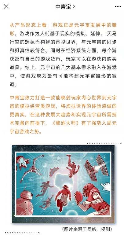 今日早盤,“元宇宙”概念的爆發(fā)與一則消息有關(guān)。中青寶在官方微信上表示,將推出虛擬與現(xiàn)實(shí)夢幻聯(lián)動模擬經(jīng)營類的元宇宙游戲《釀酒大師》,這是一次打破次元壁的嘗試,游戲與真實(shí)邊界開始走向消融。