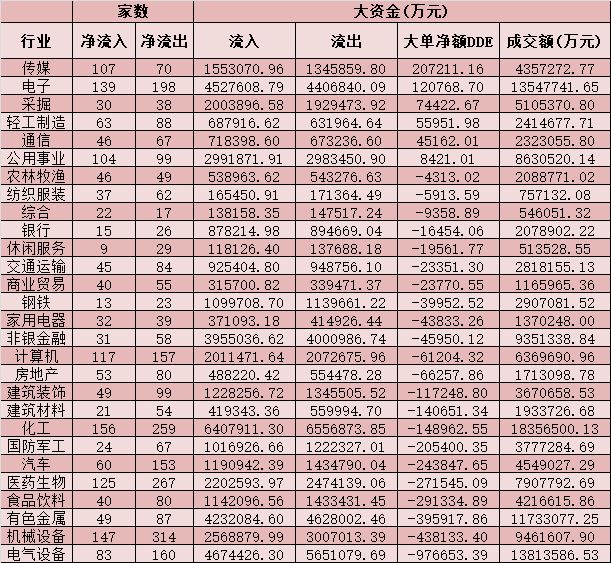 表:周三申萬一級行業(yè)大單資金凈流入情況
