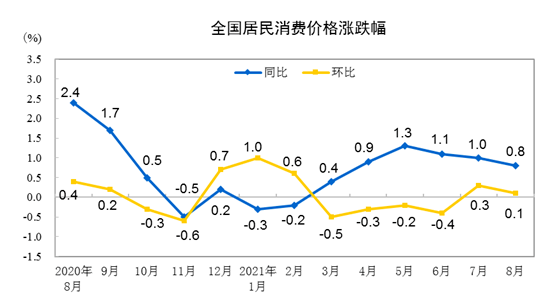 從環(huán)比看,CPI上漲0.1%,漲幅比上月回落0.2個百分點。從同比看,CPI上漲0.8%,漲幅比上月回落0.2個百分點。