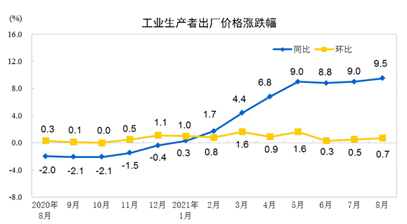 8月份,受煤炭、化工和鋼材等產(chǎn)品價格上漲影響,工業(yè)品價格環(huán)比和同比漲幅均有所擴大。