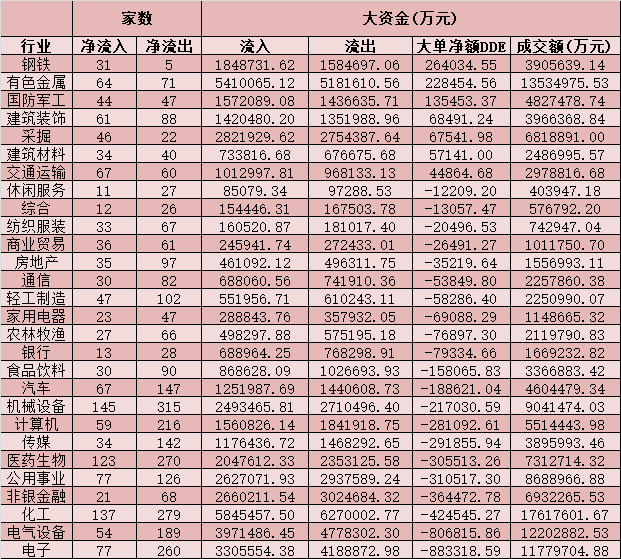 表:周四申萬一級行業(yè)大單資金凈流入情況