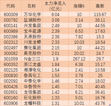 9月13日,化肥行業(yè)板塊指數(shù)報(bào)1570.88點(diǎn),漲幅達(dá)6.38%,成交190.75億元,換手率7.15%。板塊中有多達(dá)18只非ST類個(gè)股上漲,首日上市的金三江大漲267.12%。此外,有萬華化學(xué)(6.04億元)、鹽湖股份(3.06億元)、興發(fā)集團(tuán)(2.49億元)、寶豐能源(2.39億元)、天原股份(2.38億元)、川發(fā)龍蟒(2.33億元)、雅化集團(tuán)(2.15億元)、奧克股份(2.01億元)、N金三江(1.90億元)、浙江龍盛(1.84億元)、湘潭電化(1.54億元)、魯西化工(1.53億元)、中泰化學(xué)(1.46億元)、華魯恒升(1.45億元)、龍佰集團(tuán)(1.42億元)、巨化股份(1.33億元)、龍?bào)纯萍迹?.31億元)等17只個(gè)股大單資金流入過億元,合計(jì)36.63億元。