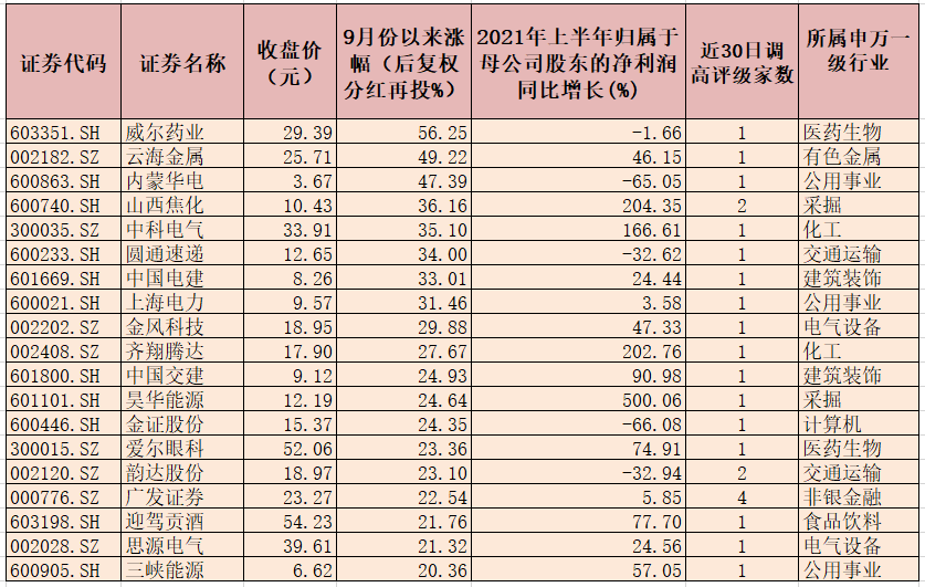 從市場(chǎng)表現(xiàn)來(lái)看,9月份以來(lái),上述207只獲得調(diào)高評(píng)級(jí)的個(gè)股中有112只個(gè)股實(shí)現(xiàn)上漲,占比超五成,其中,威爾藥業(yè)、云海金屬、內(nèi)蒙華電、山西焦化、中科電氣、圓通速遞、中國(guó)電建、上海電力等8只個(gè)股期間累計(jì)漲幅均超30%,表現(xiàn)強(qiáng)勢(shì)。