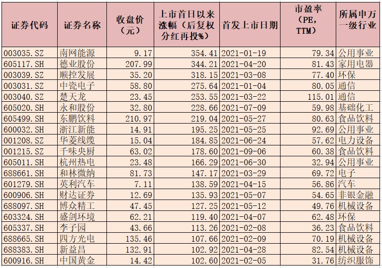 市場表現(xiàn)方面,截至10月8日收盤,有104只個股與首發(fā)上市日的收盤價相比實現(xiàn)上漲,南網(wǎng)能源、德業(yè)股份、順控發(fā)展、中瓷電子、楚天龍、永和股份、東鵬飲料等7只個股期間累計漲幅均超兩倍。