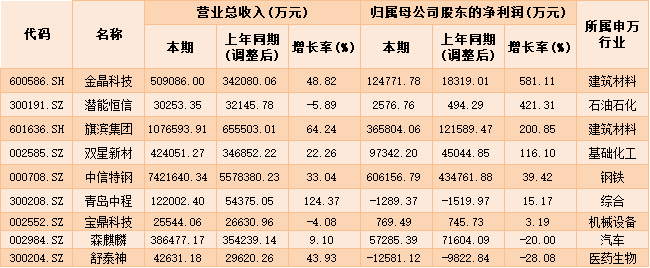 滬深兩市2021年首批三季報出爐,截至發(fā)稿,共有9家公司公布三季報,其中,金晶科技前三季度歸母凈利潤12.48億元,同比增長581.11%增幅第一位。此外,潛能恒信、旗濱集團、雙星新材、中信特鋼、青島中程、寶鼎科技等6家公司今年前三季度均實現(xiàn)歸母凈利潤同比正增長。