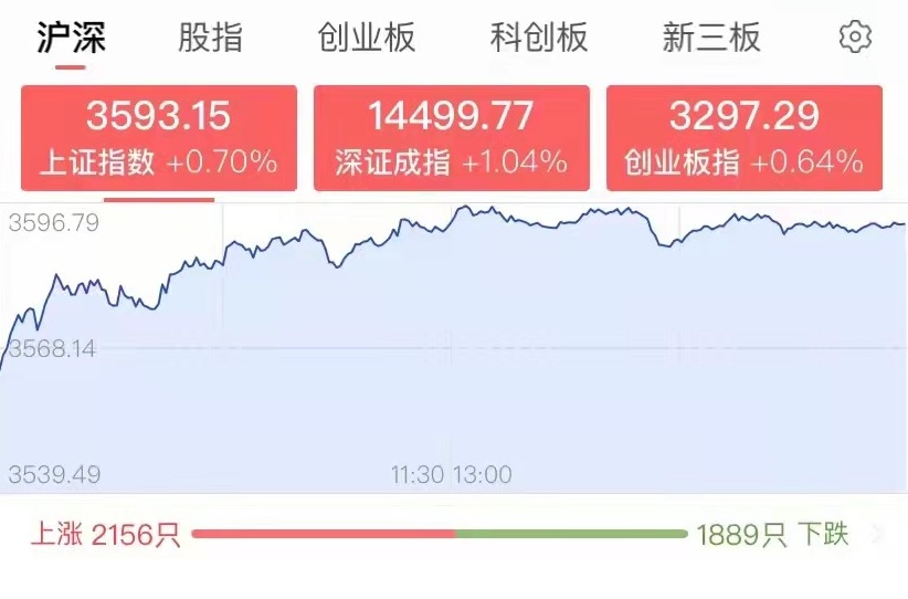 強勢震蕩!周二,A股三大指數(shù)震蕩走強,集體收漲。截至收盤,上證指數(shù)漲幅達(dá)0.7%,報3593.15點,深證成指漲幅達(dá)1.04%,報14499.77點,創(chuàng)業(yè)板指漲幅達(dá)0.64%,報3297.29點;兩市合計成交9733億元,略有萎縮,北向資金凈流入39.06億元。