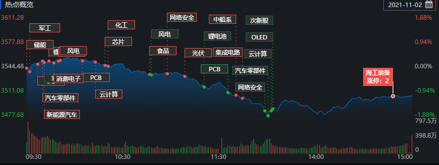 11月2日,A股市場呈現(xiàn)震蕩下行走勢,午后快速探低,滬指一度跌近2%至3500點以下。國防軍工、食品加工、種植業(yè)等多板塊持續(xù)活躍,中船系全天強勢領(lǐng)漲,中船應(yīng)急午后封住漲停,證券、銀行等大金融板塊走弱,煤炭、鋼鐵等周期股大幅下挫。