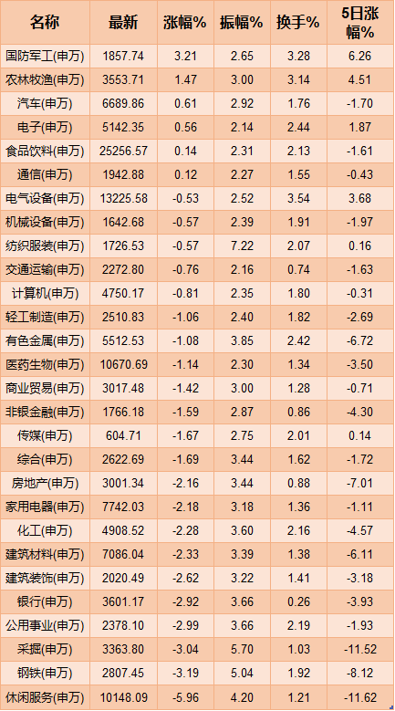 從申申萬行業(yè)指數(shù)方面來看,僅國防軍工、農(nóng)林牧漁、汽車、電子、食品飲料、通信等6個行業(yè)指數(shù)實現(xiàn)上漲,其余行業(yè)指數(shù)均有不同程度的下跌,采掘、鋼鐵、休閑服務(wù)等3個行業(yè)指數(shù)跌幅居前,均跌超3%。