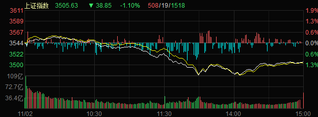 截至收盤,上證指數(shù)跌1.1%,報3505.63點;深證成指跌0.69%,報14377.27點;創(chuàng)業(yè)板指漲0.23%,報3339.6點,滬深兩市合計成交額12581.41億元,兩市成交額連續(xù)第8個交易日突破1萬億元;兩市個股也呈現(xiàn)普跌態(tài)勢,超3364只個股收跌。