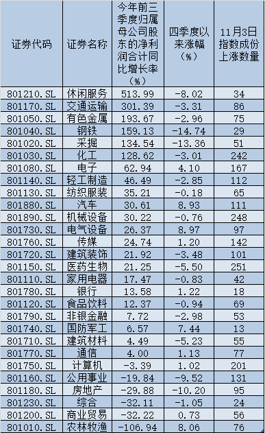 表:今年前三季度申萬一級(jí)行業(yè)業(yè)績表現(xiàn)