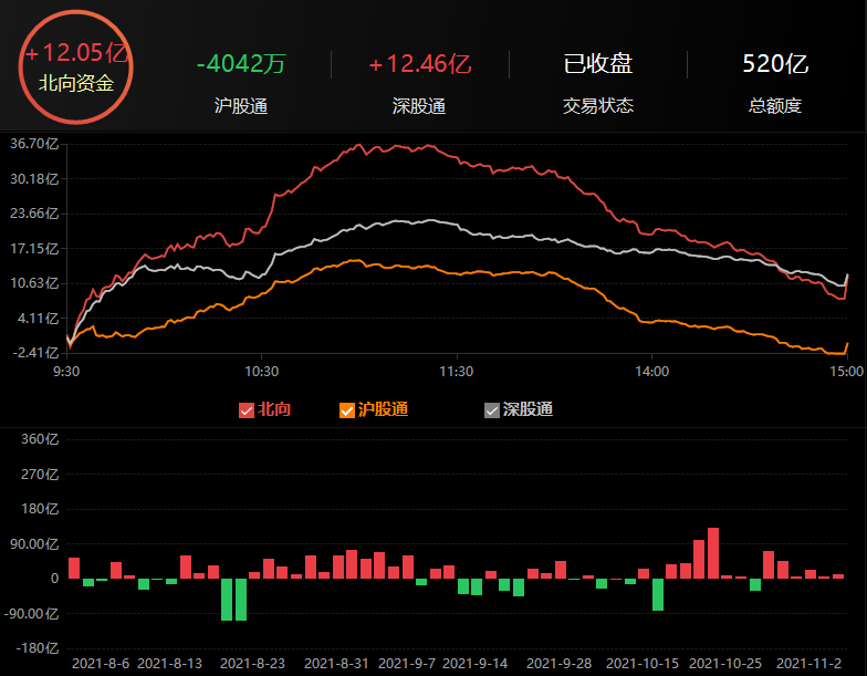 11月3日,北向資金凈買入12.05億元,其中,滬股通凈買入額達-4042萬元,深股通凈買入額達12.46億元。