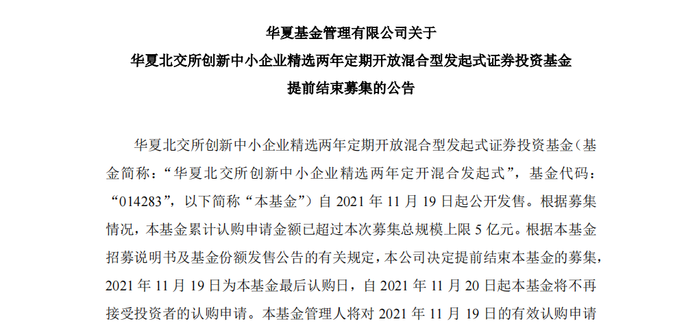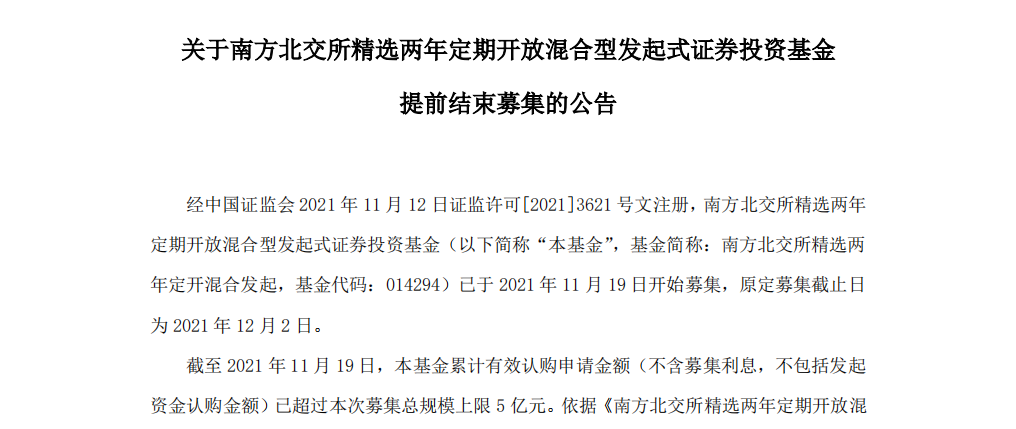 公告均稱,基金累計認購申請金額已超過募集總規(guī)模上限5億元,決定提前結(jié)束募集,11月19日為基金最后認購日。自11月20日起基金將不再接受投資者的認購申請。基金管理人對2021年11月19日的有效認購申請采用“末日比例確認”的原則給予部分確認,未確認部分的認購款項將在募集期結(jié)束后退還給投資者。比例確認的結(jié)果將另行公告。