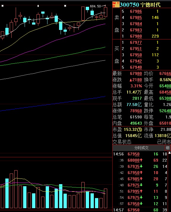 與此同時(shí),周一,新能源概念板塊繼續(xù)向前沖。鵬輝能源20%漲停,德方納米漲近16%,遠(yuǎn)東股份、方正電機(jī)、金辰股份等紛紛漲停,新能源龍頭寧德時(shí)代盤中一度漲超3%,股價(jià)最高沖至684.5元,再創(chuàng)歷史新高。目前寧德時(shí)代市值逼近1.6萬億元,排A股第三,即將超越工商銀行,挑戰(zhàn)貴州茅臺(tái)。有投資者測(cè)算,寧德時(shí)代2018年6月登錄創(chuàng)業(yè)板,彼時(shí)發(fā)行價(jià)只有30元左右,而今僅3年多時(shí)間,寧德時(shí)代股價(jià)已經(jīng)來到680元左右,投資收益率超2000%。