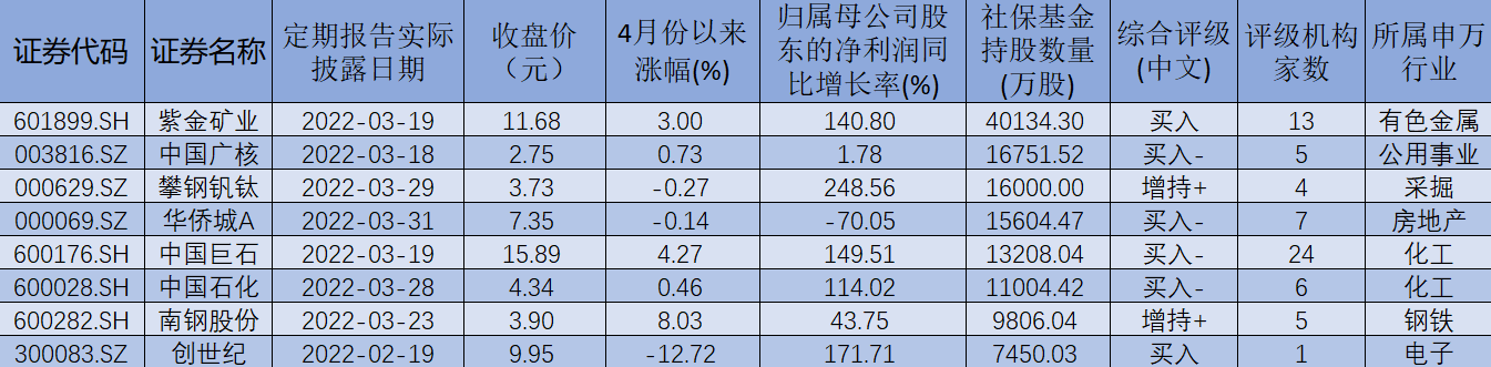 表:4月份以來截至4月11日,在社?;鹦逻M增持股中,持股總數(shù)超5000萬股個股市場表現(xiàn)一覽