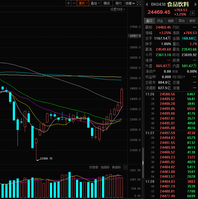 具體來看,截至4月20日11:30,食品飲料概念板塊領(lǐng)漲,漲幅達(dá)3.25%。