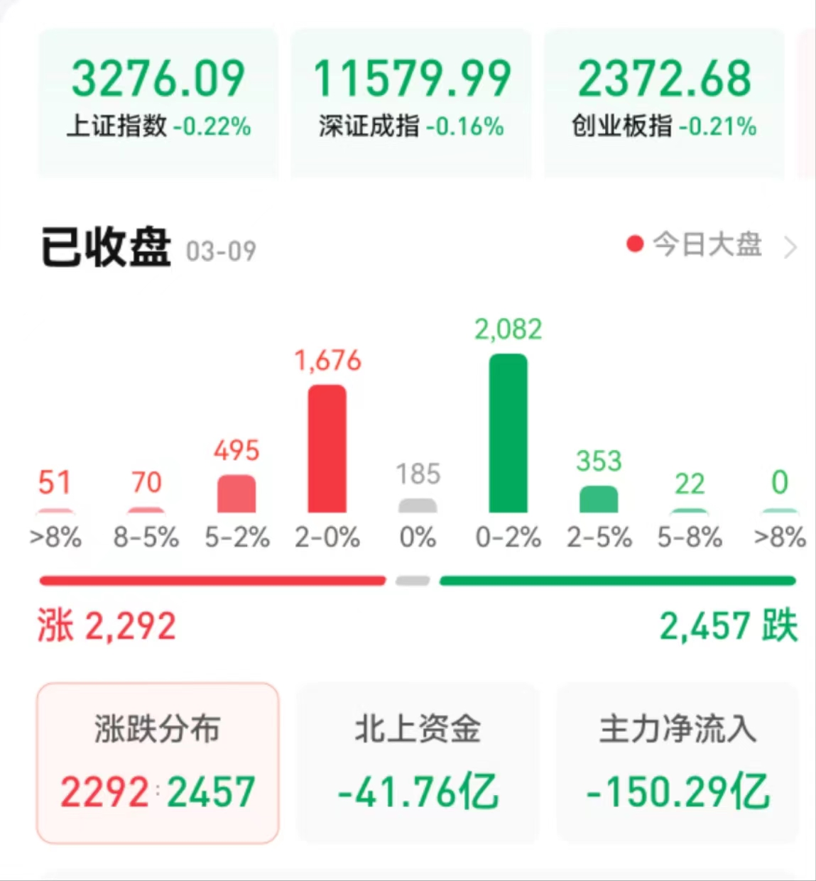 周四(3月9日),A股三大指數(shù)震蕩整理。截至收盤,上證指數(shù)跌0.22%報3276.09點,深證成指跌0.16%報11579.99點,創(chuàng)業(yè)板指跌0.21%報2372.68點;兩市合計成交7566億元,北向資金凈賣出41.76億元。總體上看,兩市個股跌多漲少。其中,漲停個股達35只,跌停2只。
