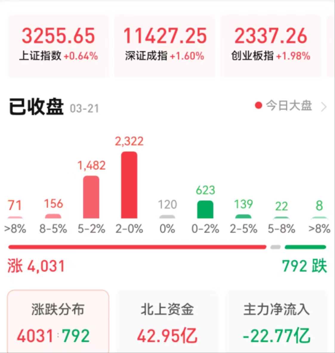 周二(3月21日),A股三大指數(shù)震蕩上行,全線飄紅。截至收盤,上證指數(shù)漲0.64%報3255.65點(diǎn),深成指漲1.6%報11427.25點(diǎn),創(chuàng)業(yè)板指漲1.98%報2337.26點(diǎn);兩市合計成交金額達(dá)8930億元。總體上看,兩市個股漲多跌少。其中,漲停個股達(dá)43只,跌停個股達(dá)10只。