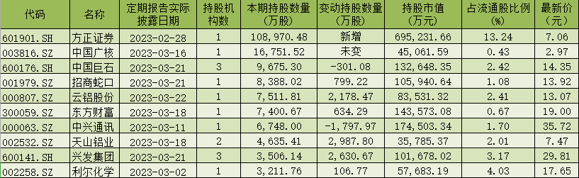 增持個股中,相比2022年三季報,天山鋁業(yè)增持?jǐn)?shù)量最多,社保基金持股合計增加2987.8萬股,另有興發(fā)集團(tuán)、云鋁股份、皖維高新等3只個股去年四季度增持超1000萬股,分別為2630.3萬股、2178.5萬股、1198.3萬股;興發(fā)集團(tuán)增持股市值最高,社?;鹪龀止墒兄岛嫌?.24億元,另有舍得酒業(yè)、云鋁股份、智飛生物、東方財富、天山鋁業(yè)、順絡(luò)電子、恩華藥業(yè)等7只個股去年四季度增持股市值超1億元。