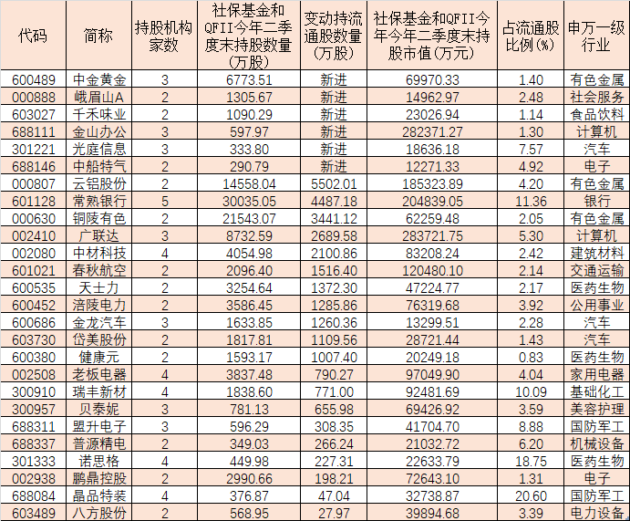 值得關(guān)注的是,今年二季度,有76家A股上市公司的前十大流通股股東中同時出現(xiàn)社?;鸺癚FII身影,合計持股市值達(dá)561.26億元。其中,26家公司今年二季度獲社?;鸷蚎FII等長線資金集體加倉,峨眉山A、光庭信息、中金黃金、千禾味業(yè)、金山辦公、中船特氣等6家公司期間獲社?;鸷蚎FII集體增持。此外,有20家公司期間獲社?;鸷蚎FII繼續(xù)加倉,包括云鋁股份、常熟銀行、銅陵有色、廣聯(lián)達(dá)、中材科技、春秋航空、天士力、涪陵電力等在內(nèi)的11家公司期間社?;鸷蚎FII累計增持?jǐn)?shù)量均超1000萬股。