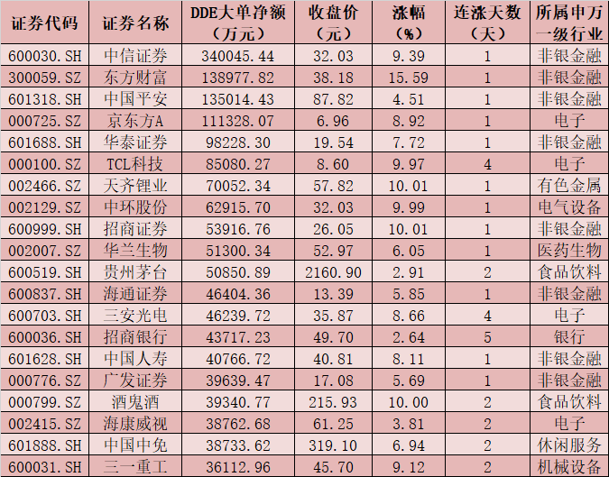 周二券商板塊有42只個(gè)股累計(jì)呈DDE大單主動(dòng)凈流入態(tài)勢,其中,中信證券(34.00億元)、東方財(cái)富(13.90億元)、華泰證券(9.82億元)、招商證券(5.39億元)、海通證券(4.64億元)、廣發(fā)證券(3.96億元)、國泰君安(2.75億元)、興業(yè)證券(2.55億元)、中金公司(2.47億元)等9只個(gè)股DDE大單凈買入額均超2億元,合計(jì)79.49億元...>>詳情