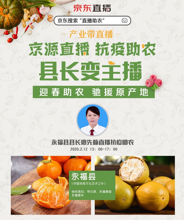 此外,京東直播還邀請當?shù)卣I(lǐng)導包括縣長、村書記走進直播間,推薦本地好貨。2月11日,廣西桂林永??h人民政府黨組織成員工信局長劉學永、龍江鄉(xiāng)黨委書記李秀及永福縣農(nóng)業(yè)局局長陶虹,親臨京東直播間,推薦家鄉(xiāng)特產(chǎn),不到一小時就吸引30余萬粉絲關(guān)注。2月12日永??h副縣長廖先梅也探訪直播間,剛上線就有40萬余人觀看。近期,京東直播還將聯(lián)合山東壽光蔬菜集團舉辦精品蔬菜直播送進社區(qū)活動,直接解決疫情期間市民不出門買菜難的煩惱。