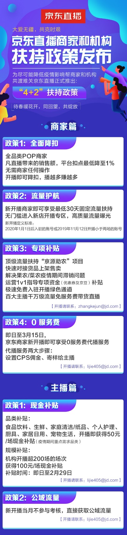 為盡可能降低疫情影響,與商家機構(gòu)和主播紅人共渡難關(guān),2月12日,京東直播宣布正式推出針對商家和機構(gòu)“全面降扣、流量護航、專項補貼、0服務(wù)費”和針對主播“現(xiàn)金補貼和公域流量扶持”的“4+2”政策。