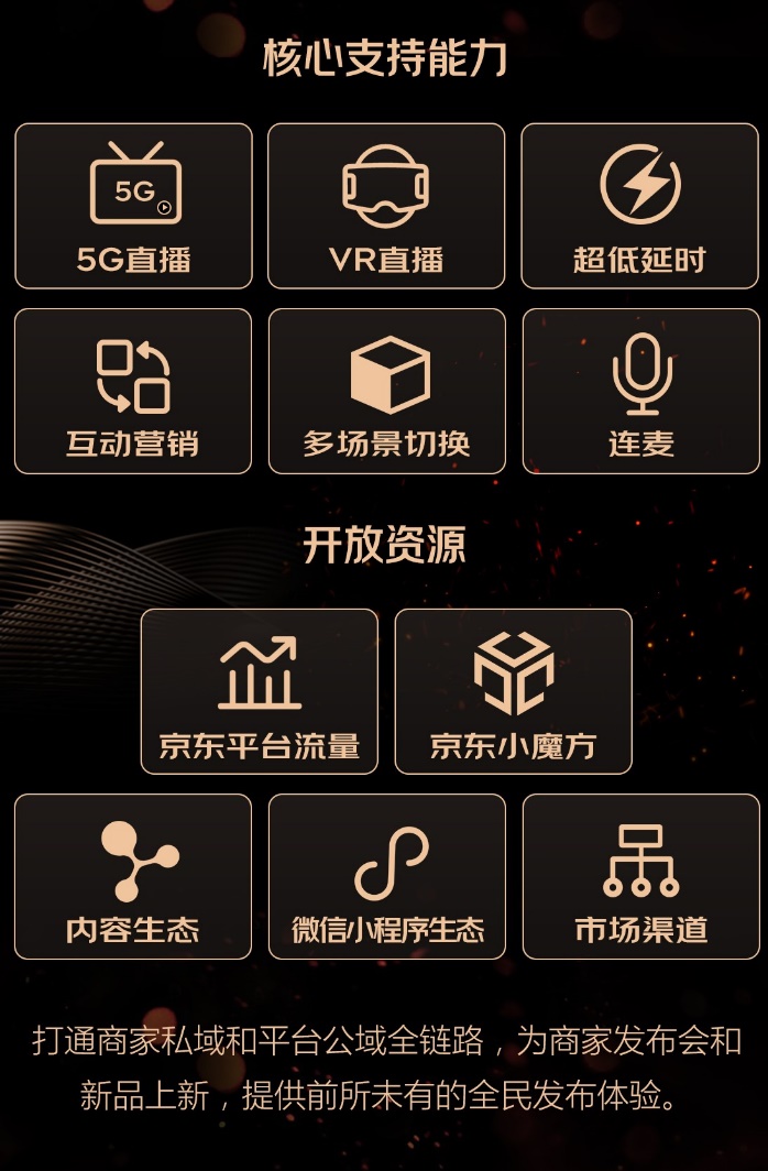 京東直播將以5G直播、超低延時、互動營銷、多場景切換、連麥等核心支持能力,并開放京東平臺流量、京東小魔方、內(nèi)容生態(tài)、微信小程序生態(tài)、市場渠道等資源,打通商家私域和平臺公域全鏈路,為商家發(fā)布會和新品上新提供前所未有的全民發(fā)布體驗。