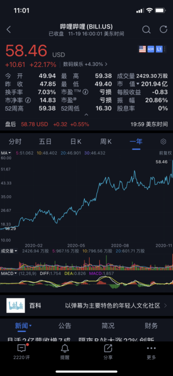 截至美東時間11月19日收盤,B站股價較前一交易日上漲22.17%,報58.46美元,創(chuàng)下歷史新高。2020年初至今,B站股價累計漲幅已超200%。目前,B站市值已突破200億美元。
