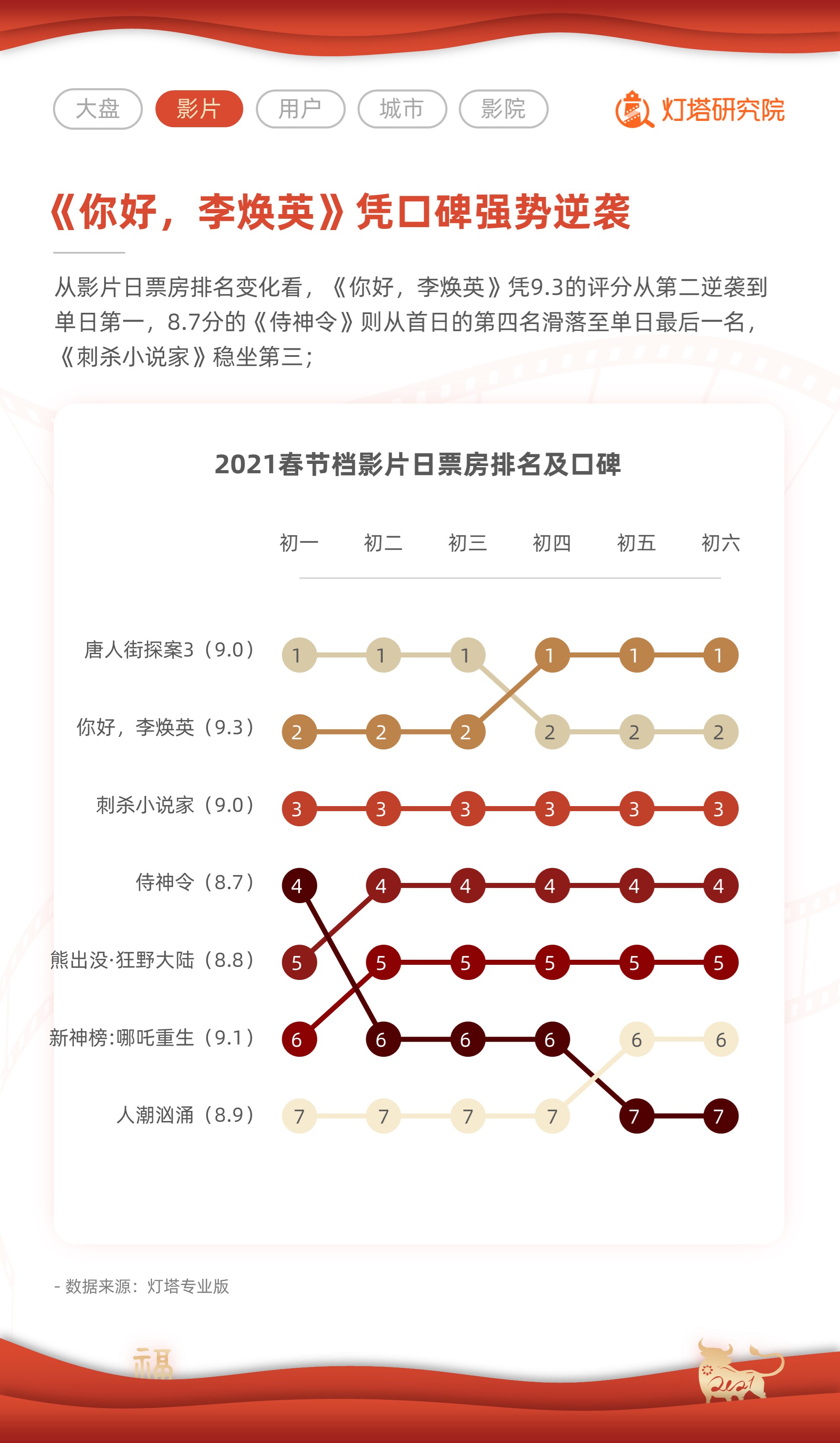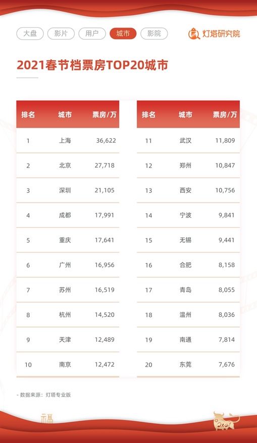 阿里影業(yè)旗下燈塔研究院《2021春節(jié)檔市場數據洞察報告》顯示,除78.22億元總票房成績較2019年大增32.5%創(chuàng)下新紀錄外,2021春節(jié)檔同時憑借1.6億總觀影人次再創(chuàng)新紀錄;票房排名前兩位的影片《唐人街探案3》(35.5億元)、《你好,李煥英》(27.2億元),將八成票房攬入囊中。