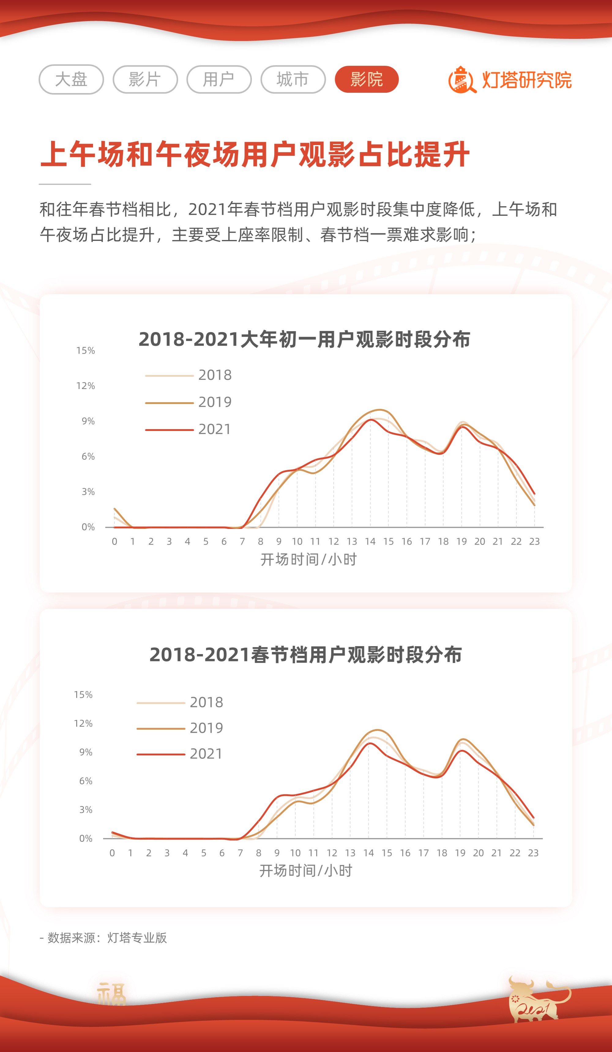 從用戶數據來看,本屆春節(jié)檔,80%的用戶僅觀看1部影片;雙人結伴觀影占比較2019年春節(jié)檔降低7%,單人和多人觀影側則均有提升。因影院上座率依舊有所限制、春節(jié)檔影片一票難求,用戶觀影時段集中度較往期春節(jié)檔有明顯降低,14:00-15:00場次依舊是最受歡迎的觀影時段,與此同時,上午場和夜場觀影占比有所提升。