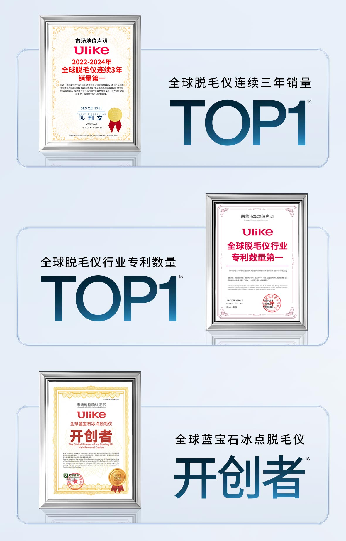 Ulike斬獲“天貓健康搶先購品牌&店鋪榜”“醫(yī)療器械搶先購首日4小時&全周期”“脫毛儀器搶先購”等數(shù)大榜單銷售榜首。Ulike25年超級新品Air4脫毛儀獲得天貓“超級新品搶先購”Top1,UlikeME脫毛儀獲得“千元脫毛儀品牌”銷售Top1。此外,Ulike超光炮美容儀獲得“光子嫩膚美容儀”銷售市占Top1。